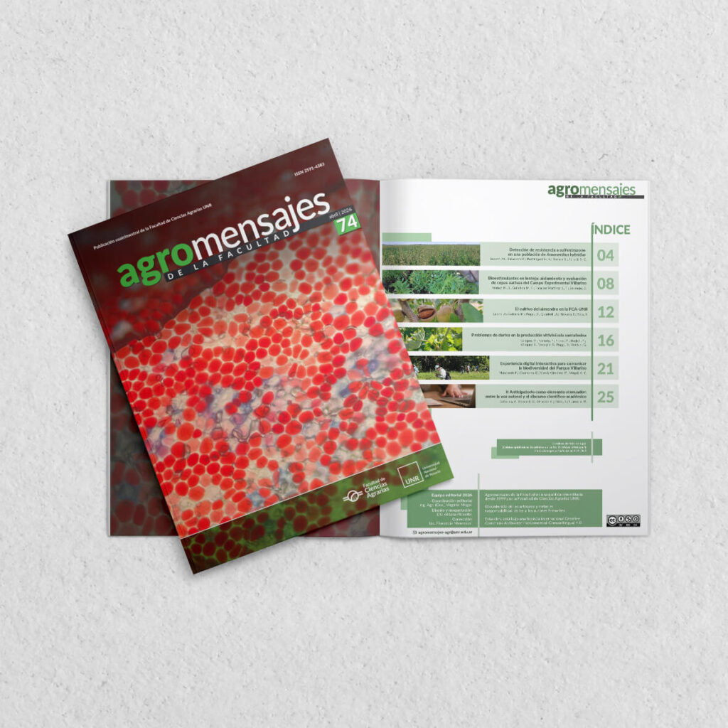 En este número otoñal encontrarán los textos: Amaranthus hybridus resistente a sulfentrazone, bioestimulantes en lenteja, cultivo de almendro en la FCA-UNR, problemas de deriva en viñedos santafesinos, experiencia digital para potenciar las visitas al Villarino y recursos lingüísticos para la escritura académica.
